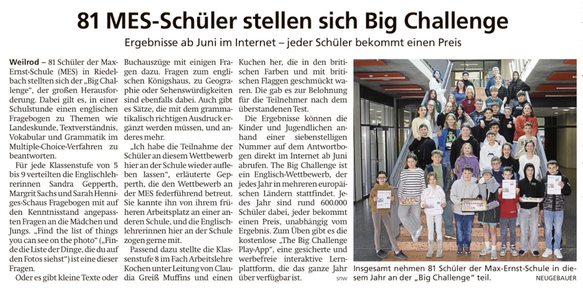 Artikel zur Teilnahme am Wettbewerb ‚The Big Challenge‘ aus der Taunus Zeitung vom 26.03.2026: